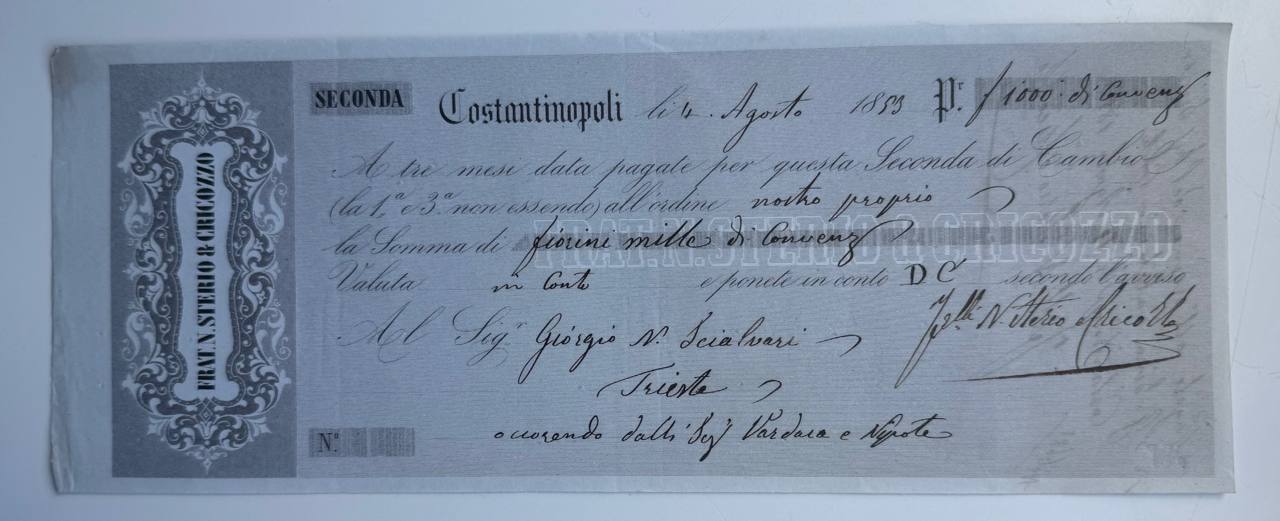 Bill of exchange issued in 1883 in Constantinople by Fratelli Stierro & Cricozzo, payable in Trieste. Beautifully printed with gray embossed border and clean layout. Excellent item illustrating Italian-Ottoman trade connections.