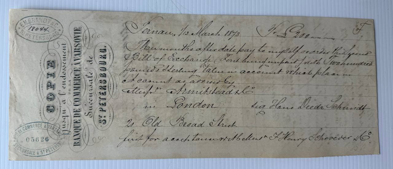 This beautiful 1873 bill of exchange originates in Pernau and features the ornate stamp of Banque de Commerce de Varsovie, St. Petersburg Branch. Valued at £200, payable in London. Dual-nature of Warsaw-based banking extended to the Russian Empire’s commercial operations. A remarkable item for Russo-European financial historians and collectors.
