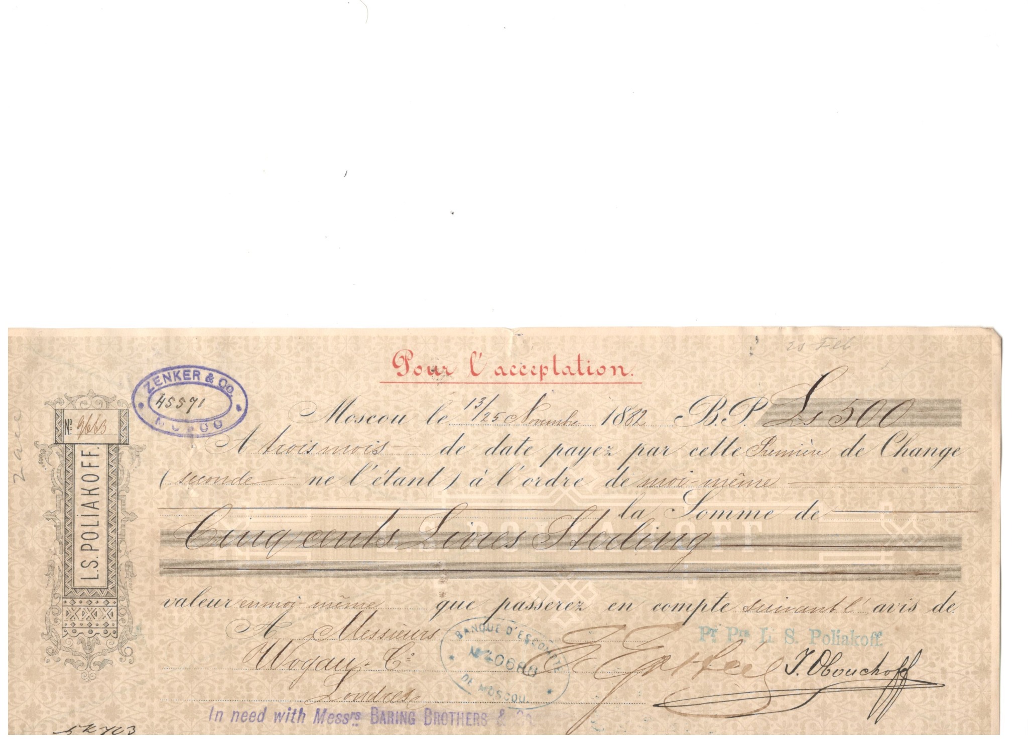 This auction features an authentic 1882 Russian bill of exchange issued in Moscow. This intricately detailed financial document represents a historic piece from the late 19th century. Issued by L. S. Poliakoff and accepted for a significant sum of 500 British pounds sterling, this bill stands as a testament to the vibrant commercial relationships of the era.