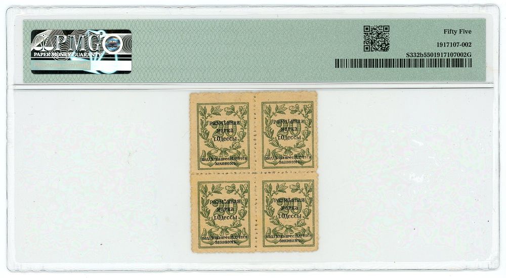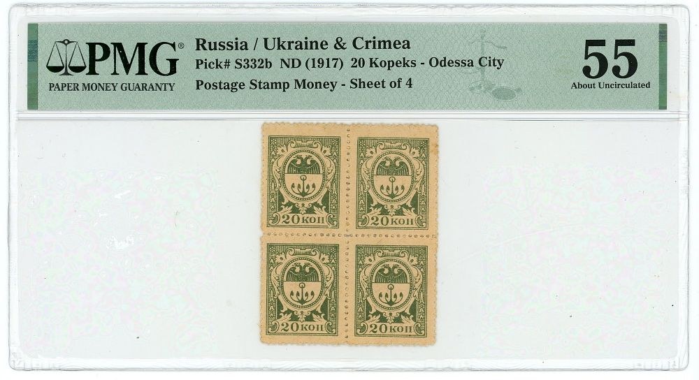 Russia Ukraine Odessa 4 x 20 Kopeks 1917 (ND) Uncut Sheet PMG 55 About UNC