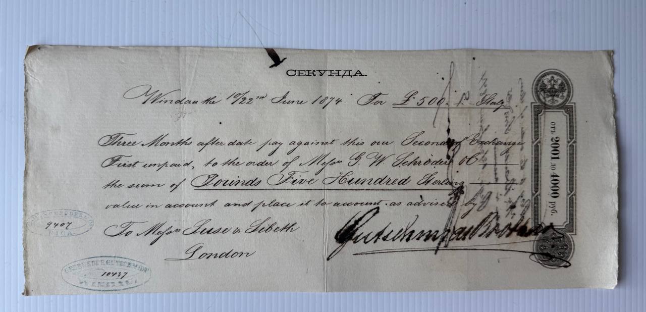 Historic Russian-Latvian Bill of Exchange issued in Windau (now Ventspils, Latvia) by the firm Gutschmann Brothers. Addressed to Schroeder & Co. in London, this financial document from the Russian Empire era is valued at 500 Pounds Sterling. A beautiful bilingual item (English and Russian), featuring the official Russian fiscal border and Imperial stamp design. Perfect example of early international trade finance.