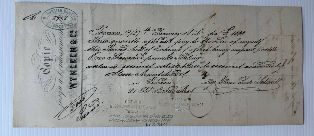 Issued by the major Baltic trading house Wyneken & Co. in Pernau (Pärnu), this 1871 bill of exchange documents a £1000 sterling value with endorsements and London clearing details. An attractive financial relic of Russo-Baltic commerce, featuring the ‘Russian Bank for Foreign Trade’ stamp. Scarce with complete manuscript and excellent calligraphy.