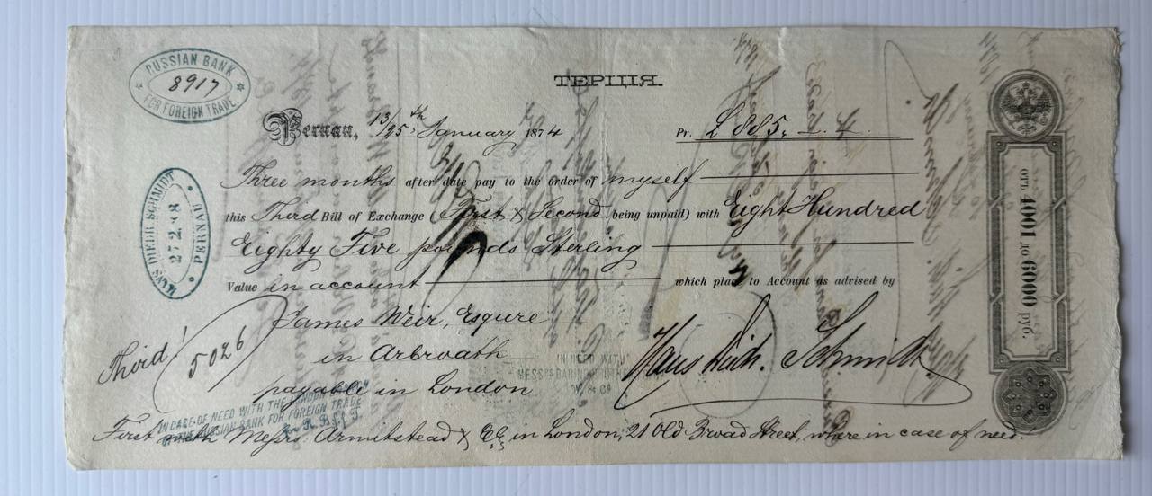 A Third Bill of Exchange issued by Hans Dietr Schmidt in Pernau (modern Estonia), dated January 1874, valued at £800 and payable in London to James Will. Includes Russian Empire fiscal design and British endorsement stamps. Exemplifies 19th-century trade finance and Baltic-Russian commercial integration.