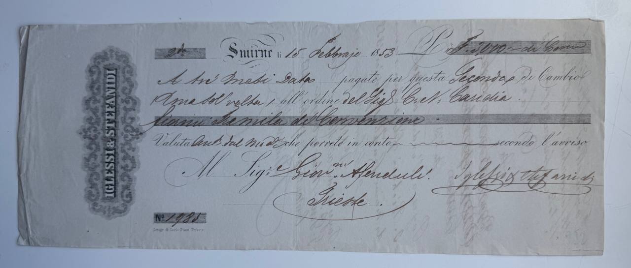 Early Ottoman-era bill of exchange issued in Smyrna (now Izmir) by the firm Iglessi & Stefanidi. Dated 1853, and addressed to Trieste. Ottoman merchant finance documents from this period are highly desirable for collectors.