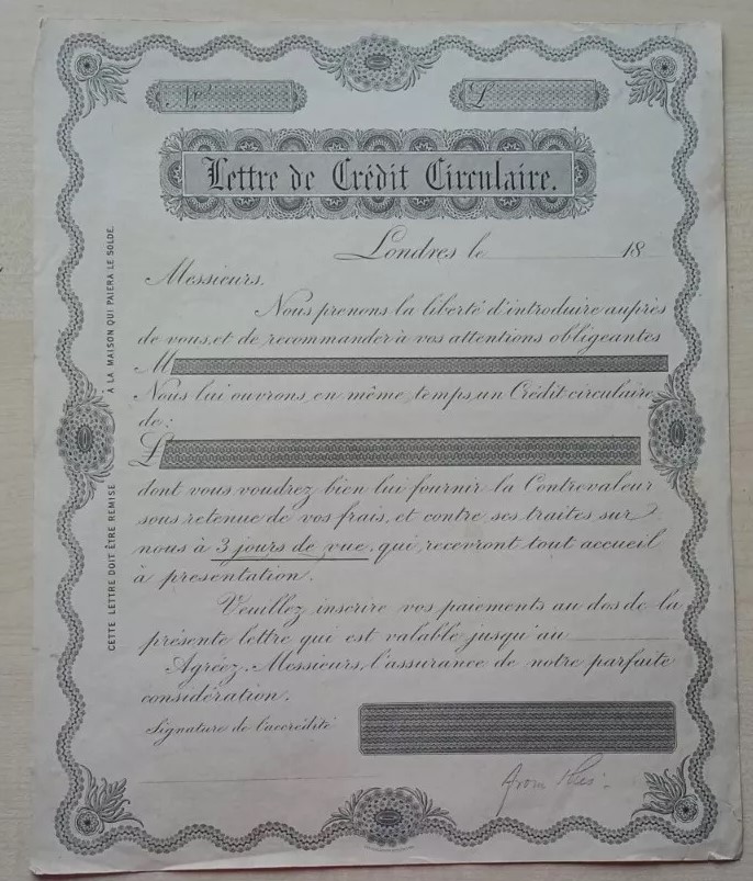 This rare 19th-century Baring Brothers circular letter of credit exemplifies the legacy of one of Britain’s most influential merchant banks. Issued in London, it facilitated international trade, guaranteeing payments across borders. The document features intricate engravings, elegant typography, and an ornate border, reflecting the sophistication of early financial instruments. As a product of Baring Brothers, a powerhouse in global finance, this piece is a valuable artifact of banking history.