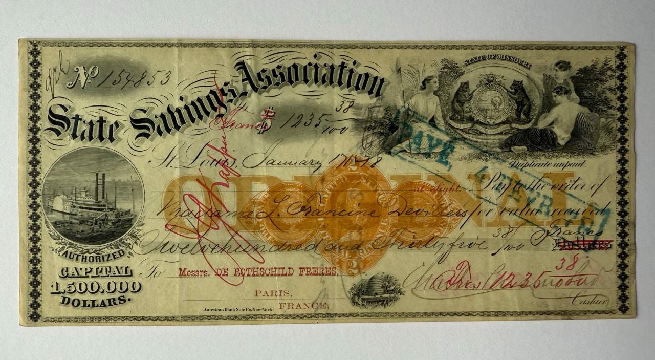 Historic U.S. bill of exchange from the State Savings Association in St. Louis, issued in 1878 for $1235 to the famed Rothschild Frères in Paris. Features ornate engravings, ‘DUPLICATE UNPAID’ notation, and Missouri state arms. A rare example of American banking tied to European finance.