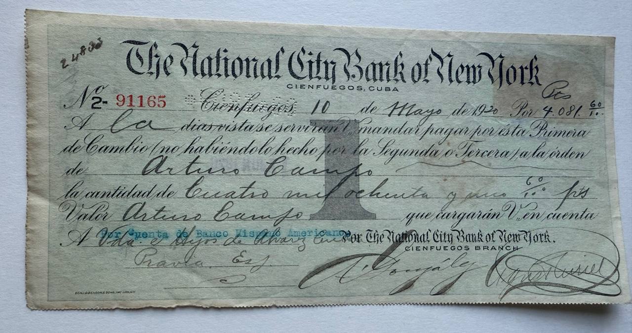 Issued by the Cienfuegos branch of the National City Bank of New York, this 1920 document illustrates US banking operations in Cuba. A prime example of early American financial influence in the Caribbean. Excellent for thematic collections on US banking abroad.