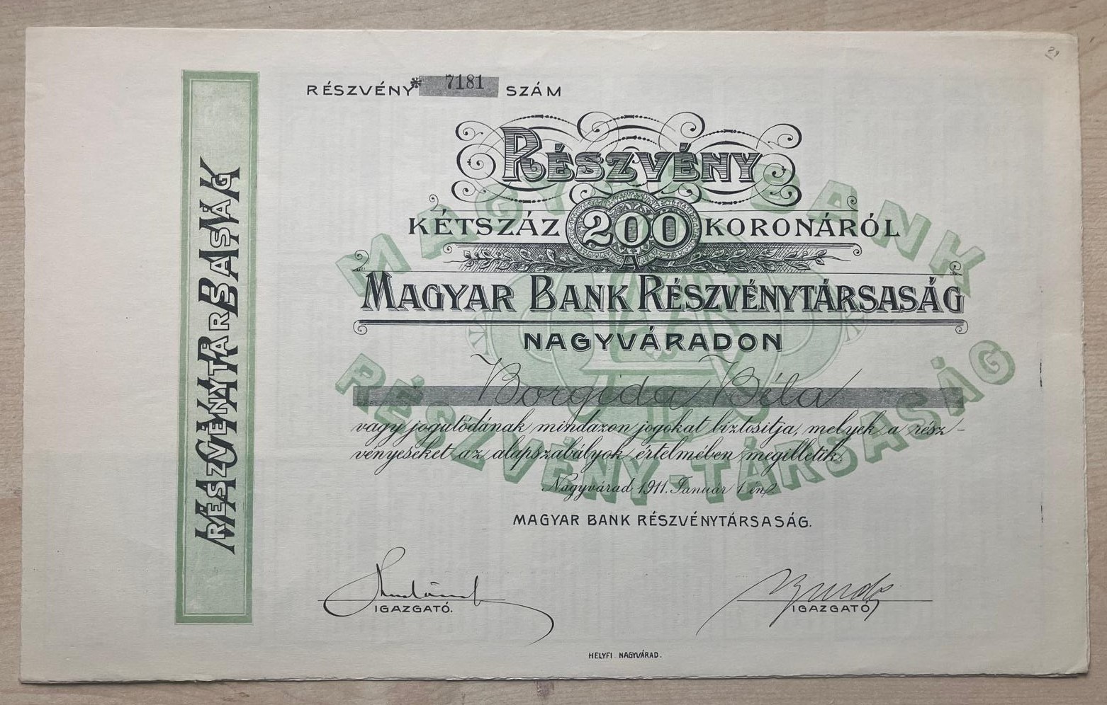 Hungary Romania 'Magyar Bank' Nagyvarad 1911 Oradea 200 Korona Share