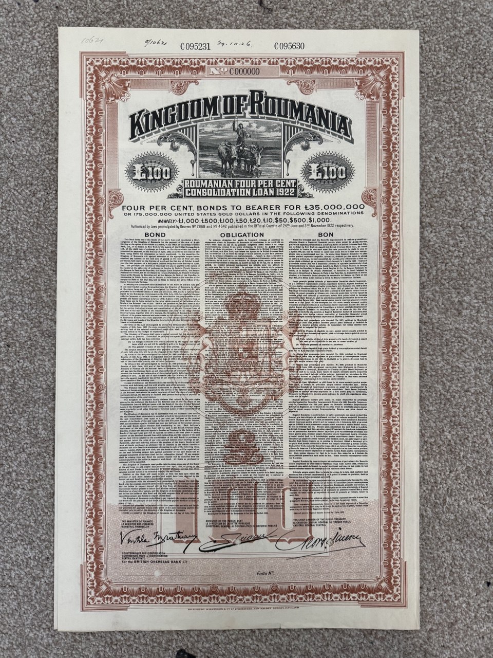 Specimen of classic £100 bond from the 1922 Roumanian 4% consolidation loan series. Brown ornate border and clean multilingual layout. An important piece reflecting Romania’s post-WWI economic realignment.