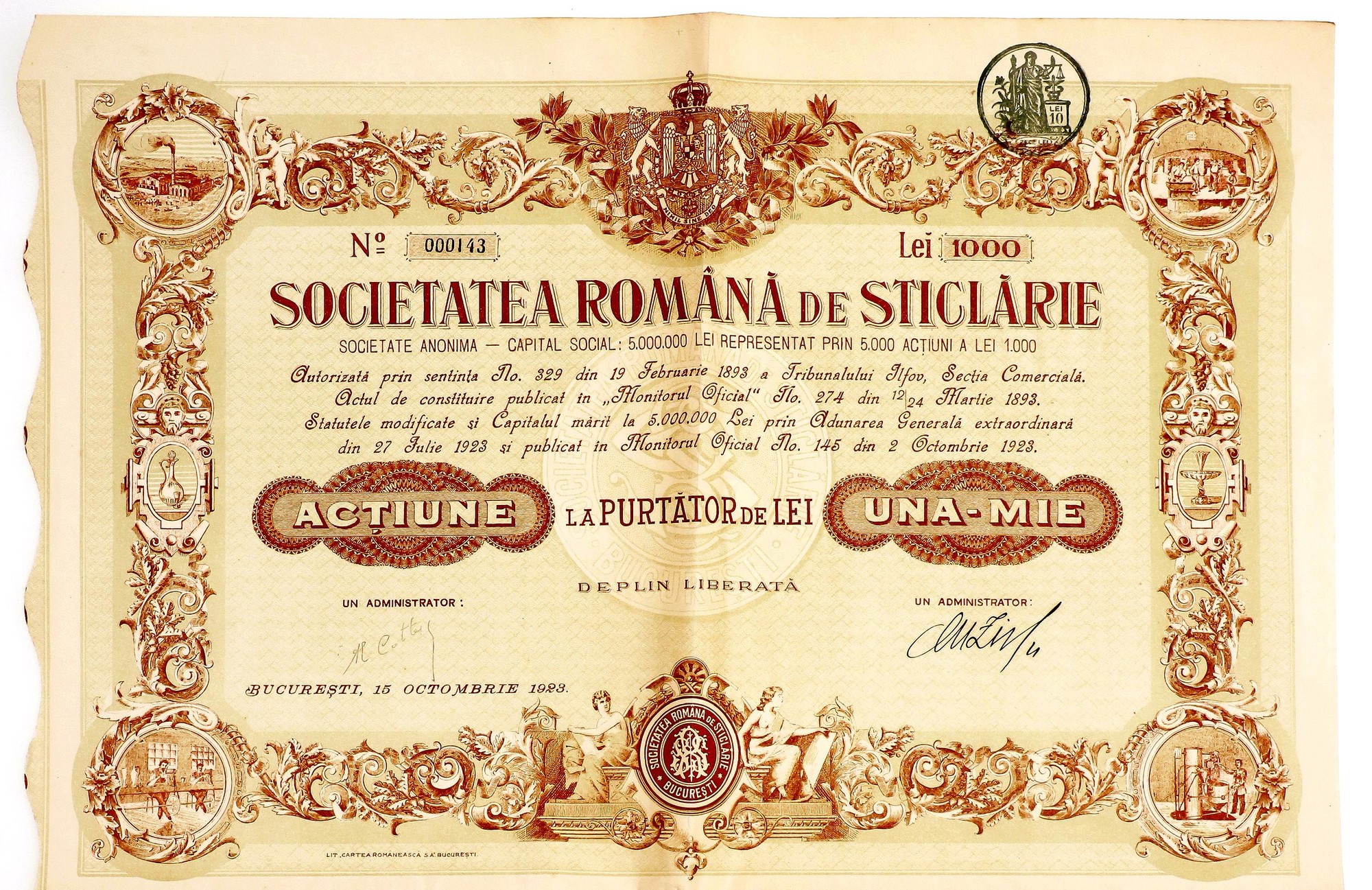 Lavishly printed share certificate from Societatea Română de Sticlărie (Romanian Glassworks Company), issued in Bucharest in 1928. Features rich baroque design and imagery related to glass production. A highly decorative and desirable piece for collectors of Romanian industry or ornate documents.