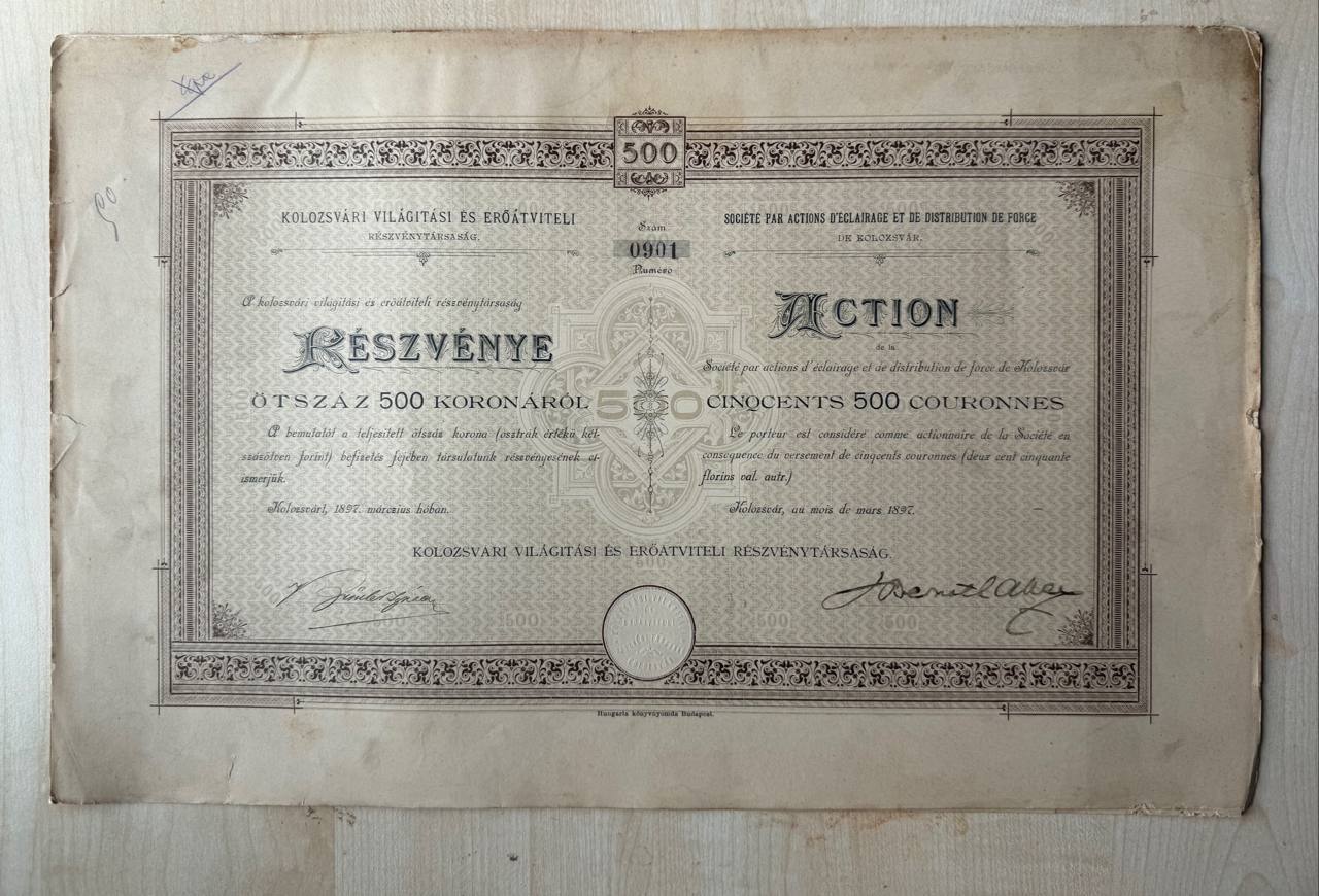 Bilingual Hungarian-French share certificate for a Transylvanian electric company in Koloszvár, issued in 1897. Early utility share with elaborate typographic design and company seal.