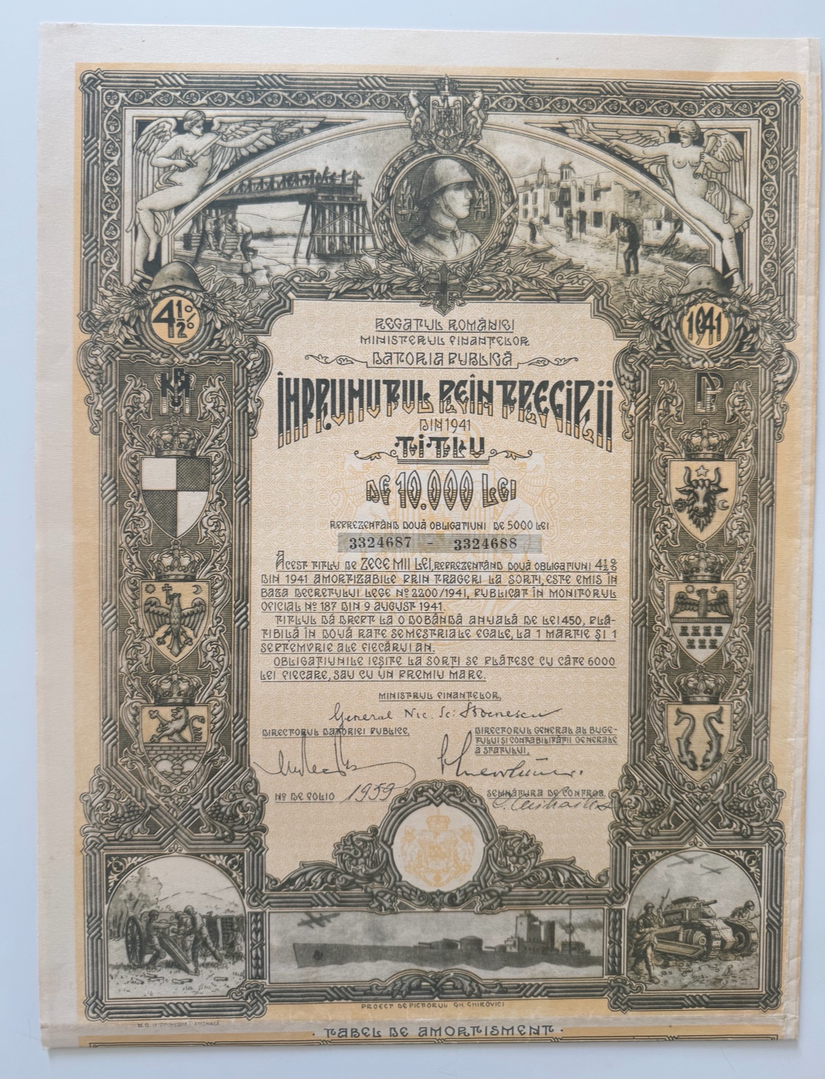 WWII Romanian War Loan Bond for 10,000 Lei, issued in 1941 by the Ministry of Finance. A double denomination bond (2 x 5000 Lei) with powerful iconography of war destruction and rebuilding. Issued to support the Romanian war effort. Highly decorative and collectible. Theme: Wartime Economy.