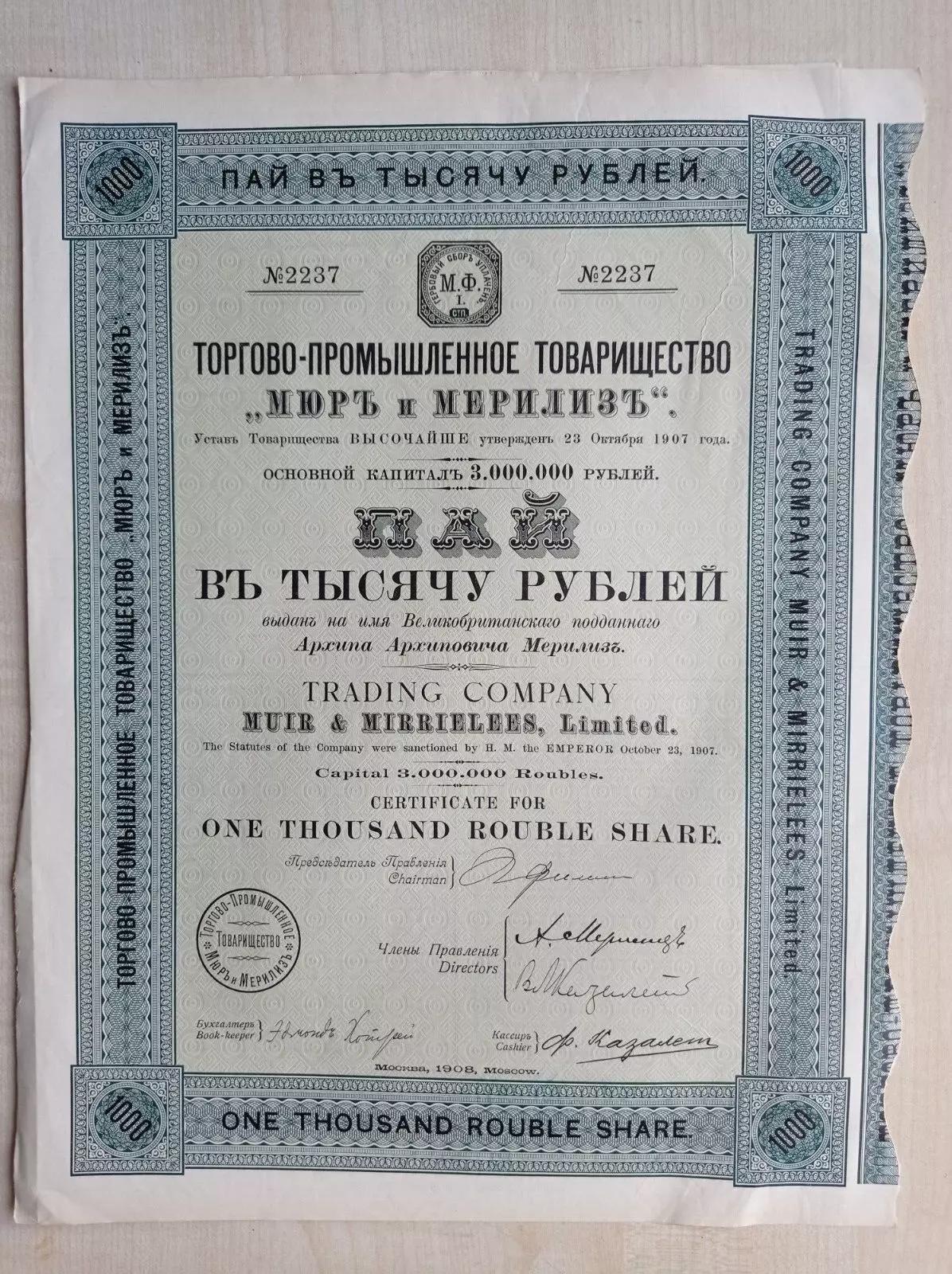 Russia "Muir & Mirrielees" Ltd ЦУМ Moscow 1000 R Share Мюръ и Мерилиз Акция Пай