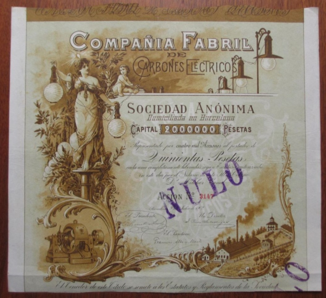 Elegant Spanish industrial share from the Compañía Fabril de Carbones Eléctricos, domiciled in Barcelona. Issued for 500 Pesetas, with allegorical illustrations of electricity and industry. A rare item for collectors of Spanish electrification and utilities history.