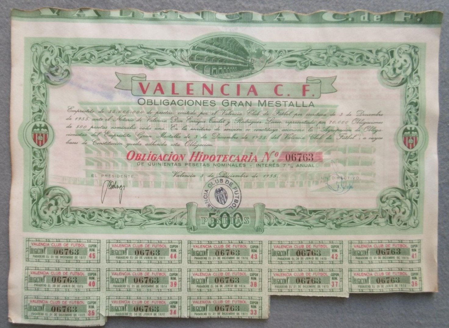 Rare 1955 mortgage bond issued by Valencia Club de Fútbol to finance the development of the Gran Mestalla stadium. Historic football-related bond with green border, stadium vignette, and coupon sheet. A gem for football and sports collectors.