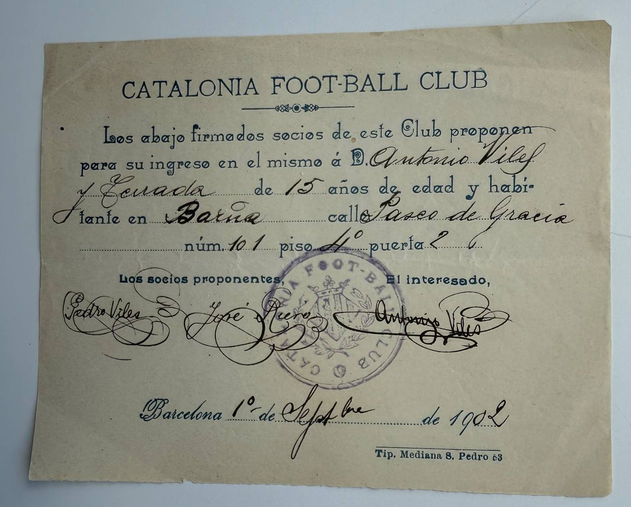 Early Catalonia Football Club membership certificate issued in Barcelona on 1st September 1902 for Antonio Viles. Signed by founding members including Pedro Viles and José Guerra. A unique and very early document in Spanish sports history—ideal for collectors of football memorabilia.