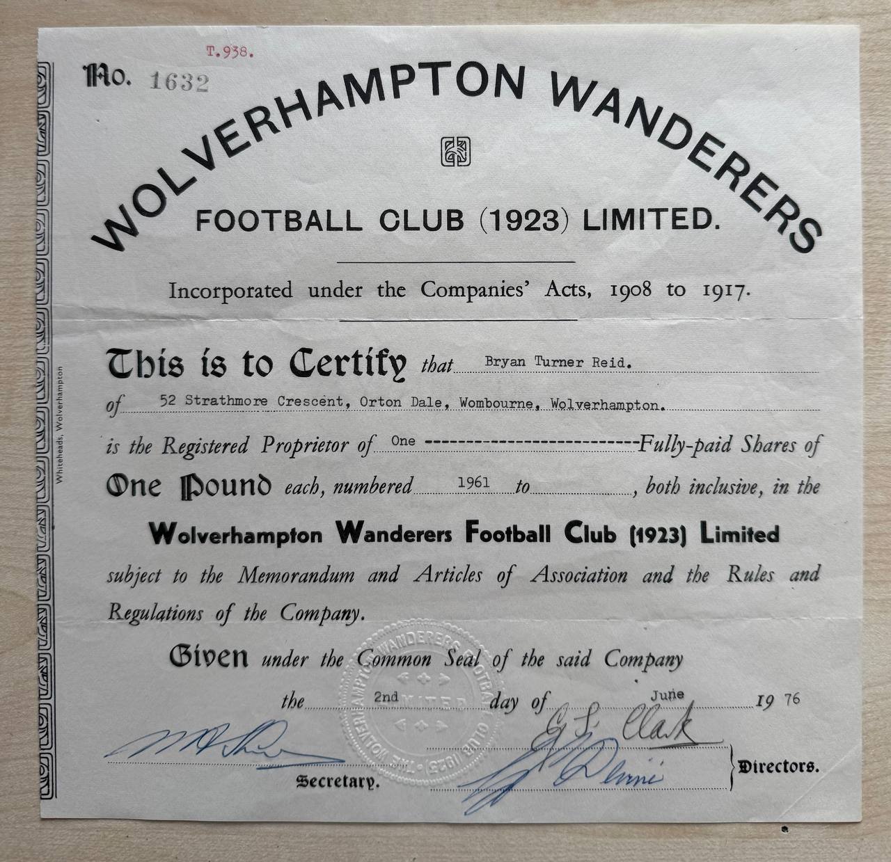 This is a rare and highly collectible share certificate from Wolverhampton Wanderers Football Club (1923) Limited, issued on June 2nd, 1976. Wolverhampton Wanderers (also known as Wolves) is one of the founding members of the Football League, and this certificate reflects the rich history and legacy of one of England’s most storied football clubs.