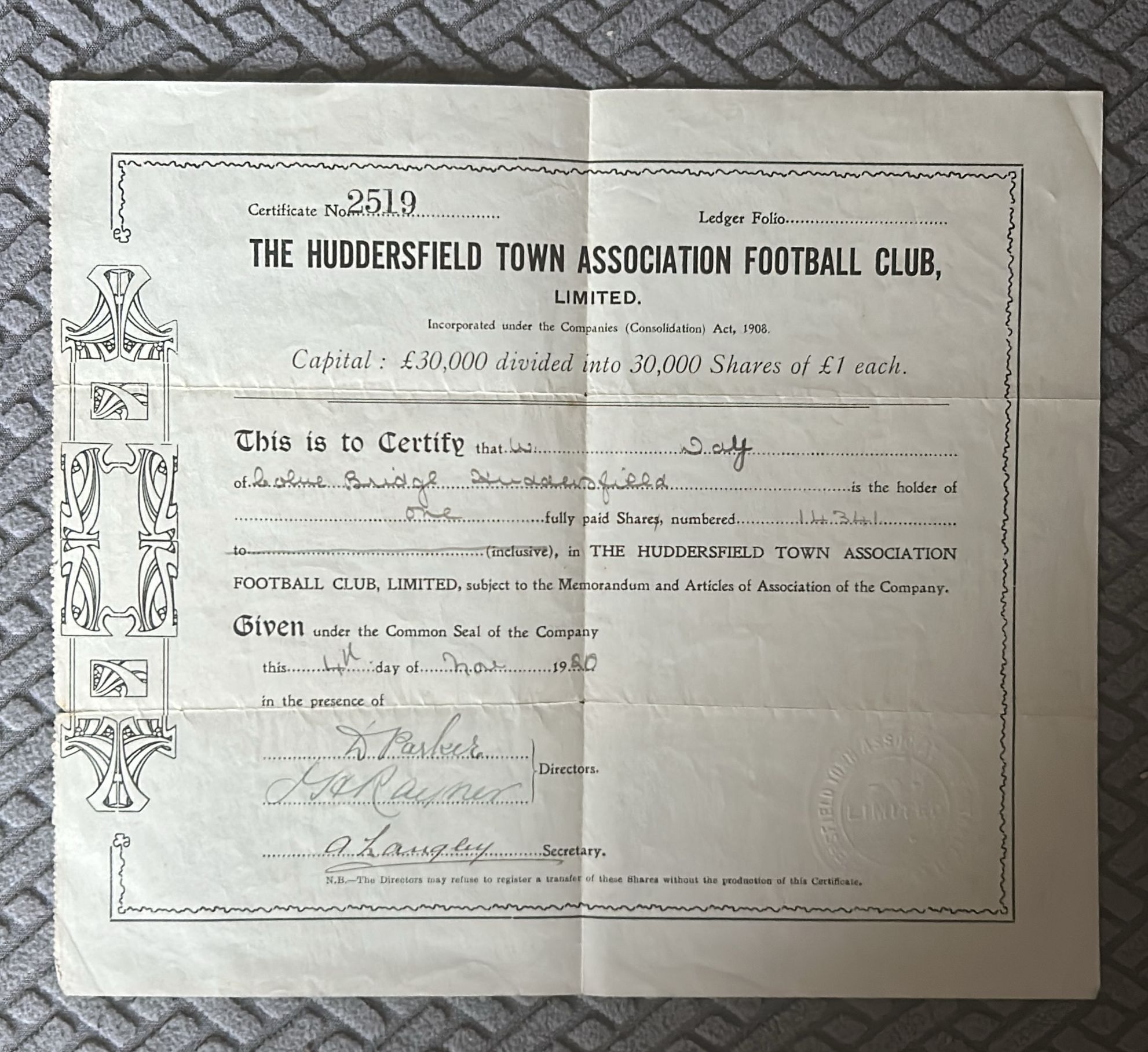 This is a rare and authentic share certificate issued by Huddersfield Town Association Football Club Limited, a historic English football club with deep roots in the football community. Founded in 1908, Huddersfield Town, famously known as "The Terriers, " has a celebrated history in English football, with notable achievements including winning three consecutive First Division titles in the 1920s. The club has maintained a dedicated fan base and continues to play an important role in English football.