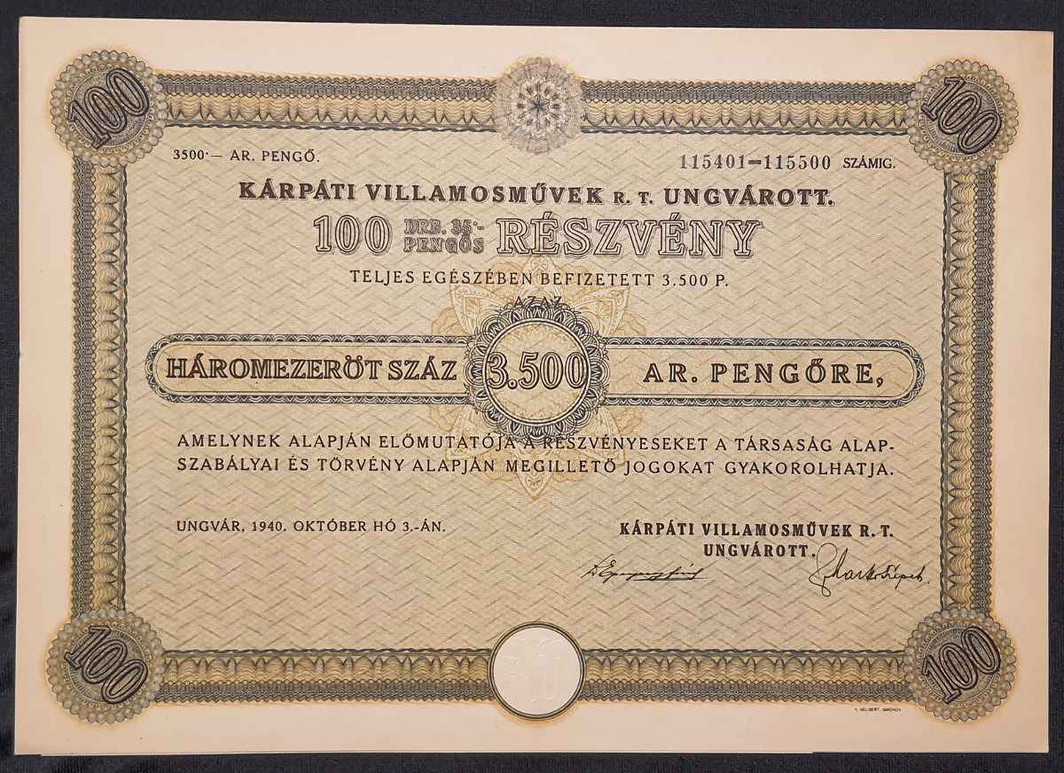 Issued in Ungvár (now Uzhhorod, Ukraine) in 1940, this share certificate represents ownership in the Kárpáti Electric Works (Kárpáti Villamosművek R.T.). This piece reflects Hungary’s industrial expansion into the Carpathian region during the interwar period, featuring elegant typography and secure watermarking typical of regional Hungarian scripophily.
