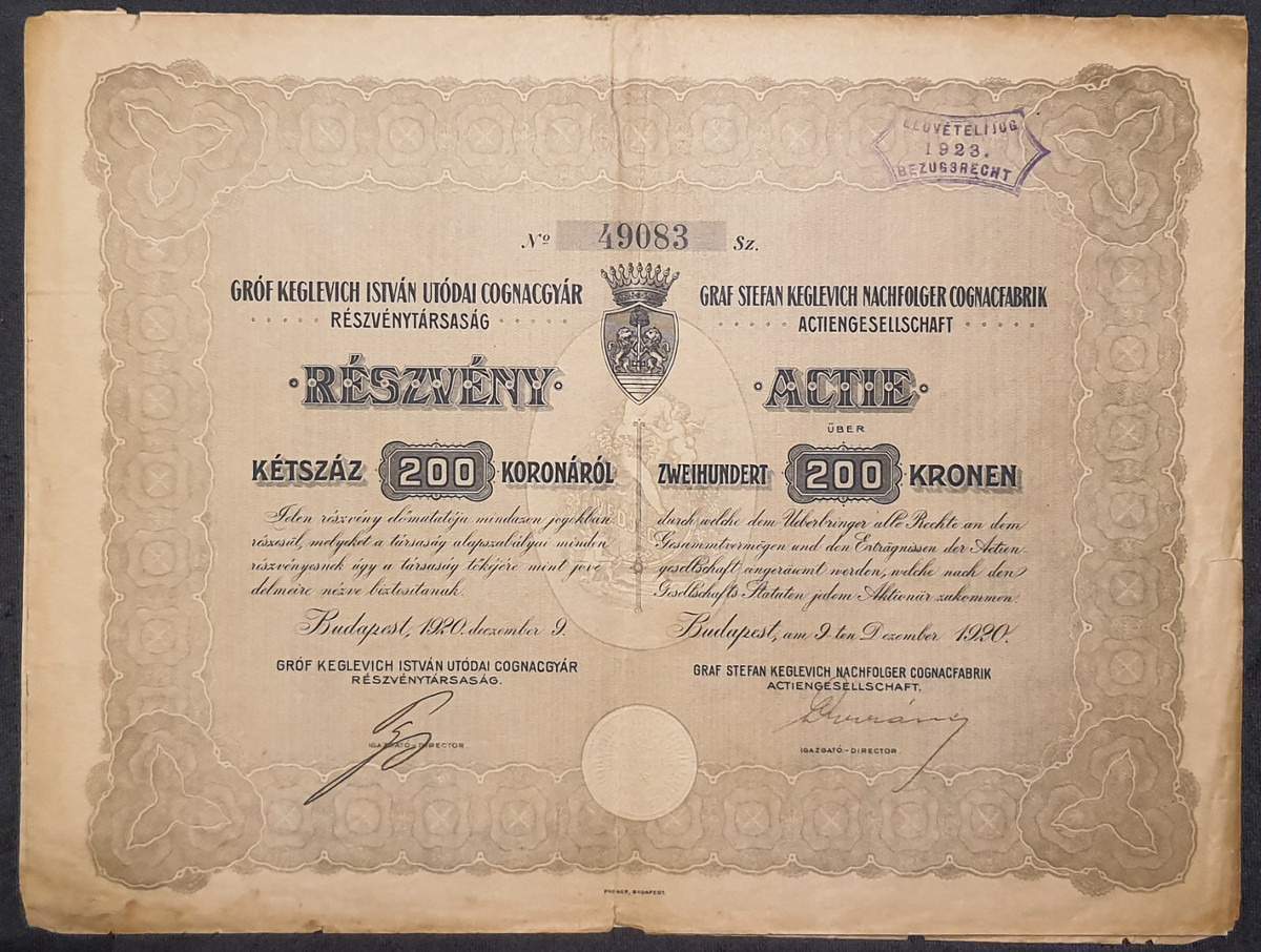 A visually striking share certificate issued in 1920 by the famous Gróf Keglevich Cognac Factory in Budapest. The Keglevich brand is still known today, and this certificate offers a glimpse into its early post-imperial capital structure and aristocratic branding.