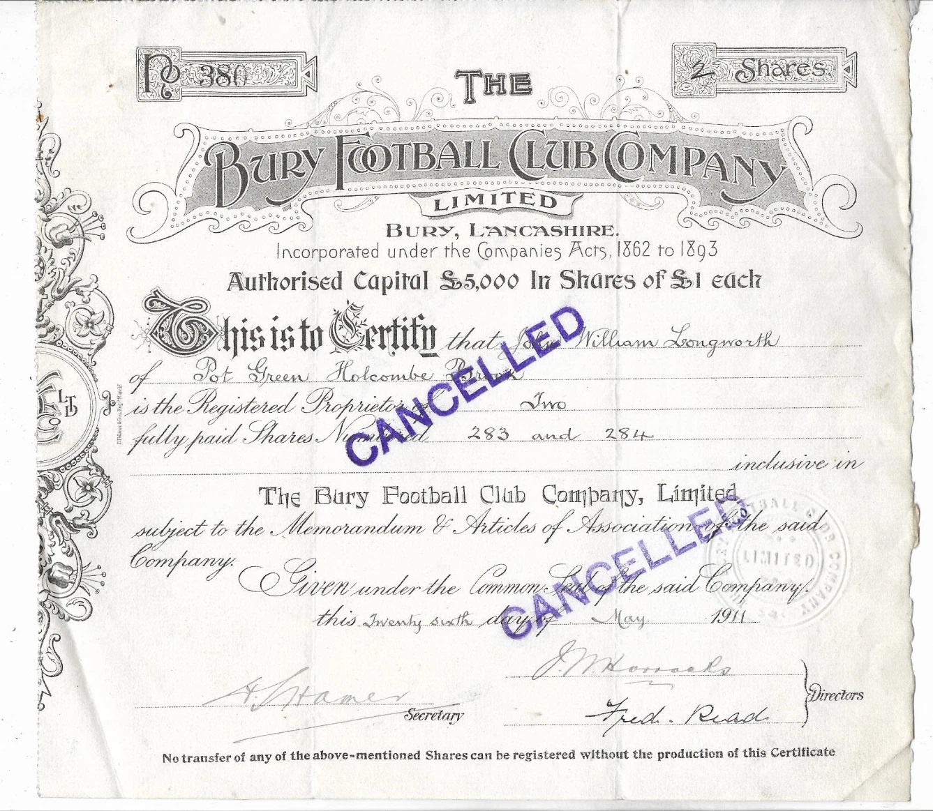 Historic share certificate issued by The Bury Football Club Company Limited, dated 1911. Certifies ownership of 2 shares. Marked CANCELLED. Classic football-related scripophily item, highly collectible for football memorabilia collectors.