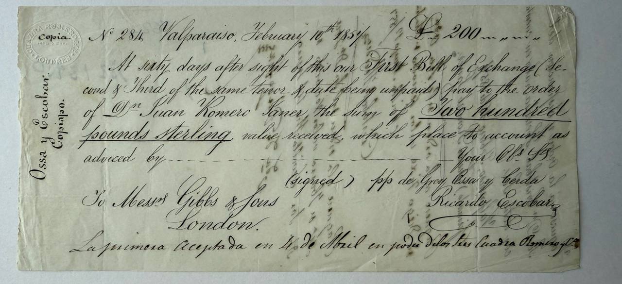 An exceptionally early Chilean bill of exchange issued in Valparaiso and payable in London for £200. A historic piece from the firm Ossa y Escobar to Gibbs & Sons. This rare and valuable document is of major interest to collectors of Anglo-Chilean trade history.