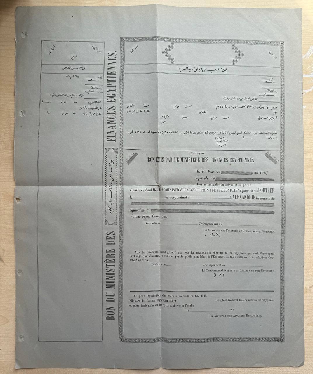 Rare bilingual Arabic-French railway bond to be issued by the Egyptian Ministry of Finance in 1881. Intended for use within Egypt’s expanding rail network. A significant and scarce piece of colonial-era infrastructure finance.