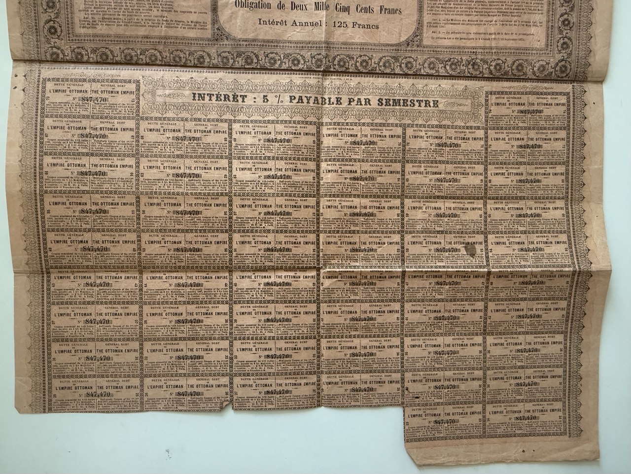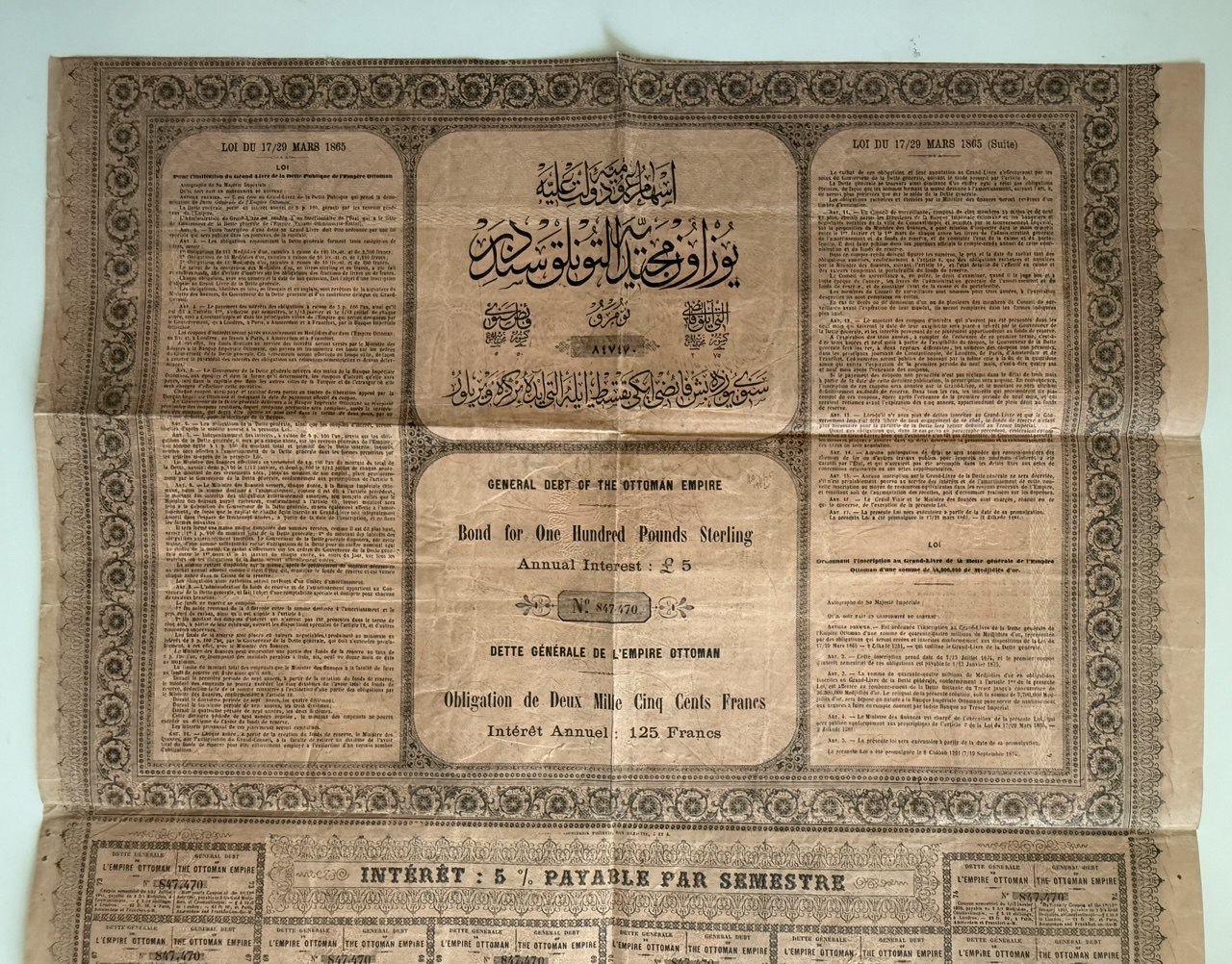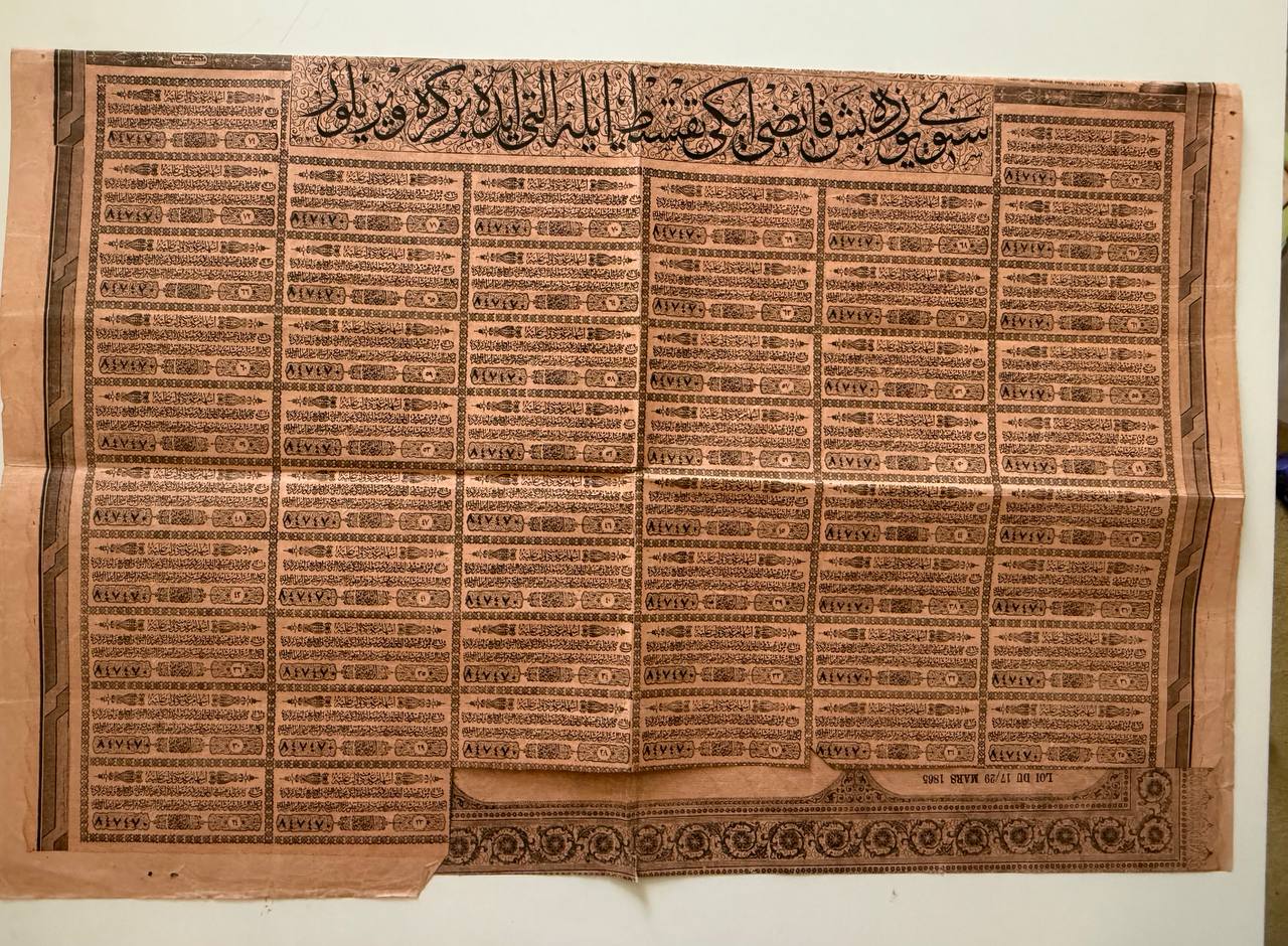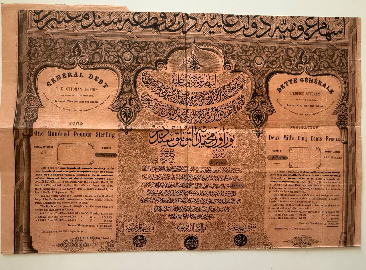 Highly ornate tri-lingual (English/French/Ottoman Turkish) bond issued by the Ottoman Empire under the General Debt Administration, following European restructuring of Ottoman debt. Issued in 1874 for £100 (highest denomination in the series) or 2,500 Francs, with 5% annual interest. An iconic and rare scripophily item from the twilight years of the Empire. A highlight for any Ottoman collection