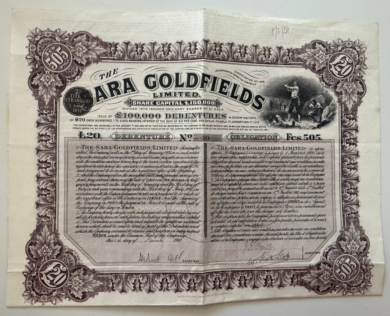 Debenture issued by The Sara Goldfields Limited in 1911, with capital listed in both £20 and 505 Francs. Features elaborate engraving and depiction of miners. A classic mining-themed investment certificate tied to colonial extractive industries.