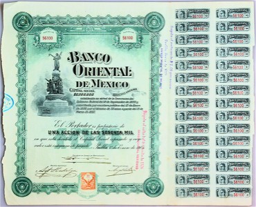 Historic share certificate issued by Banco Oriental de México in 1929 for 100 pesos. Features the iconic Angel of Independence monument. Accompanied by a full set of coupons. A beautiful example of pre-nationalization Mexican banking scripophily.