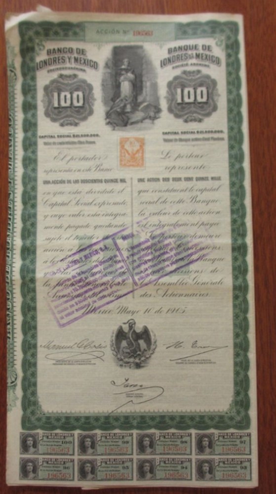 Bilingual share certificate (Spanish/French) from Banco de Londres y México, one of the most important banks in early 20th-century Mexico. Issued in 1915, with printed coupons below and attractive engraving. Theme: Banking History, Dual-Language Fiscal Documents.