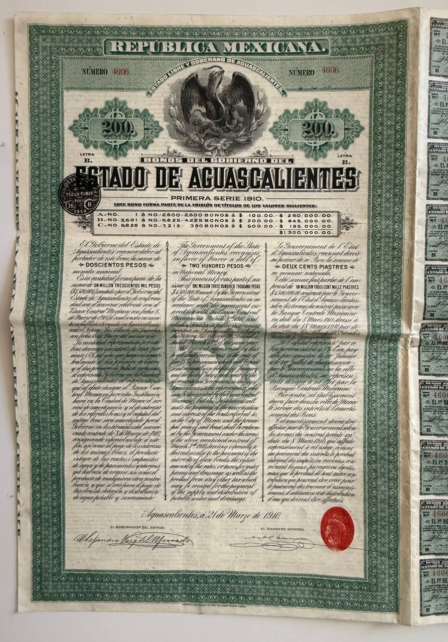 Republica Mexicana 5% Bono Tesoro $100 Loan Aguascalientes Mexico uncancelled coupons