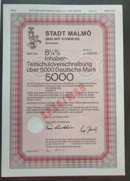 Municipal bond from the City of Malmö, issued in 1976 at 8.5% interest, denominated in Deutsche Marks. A unique example of cross-border European financing in a cold war context, bilingual text in German and Swedish. Theme: European Municipal Finance.