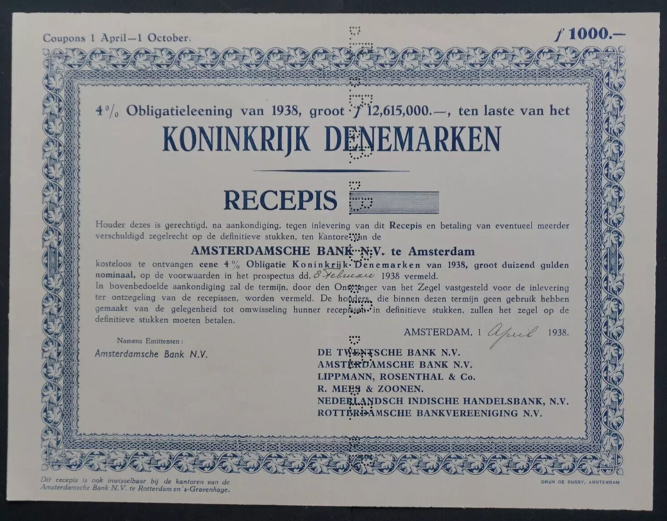 Kingdom of Denmark 4% Bond 1000 Florins 1938 Specimen