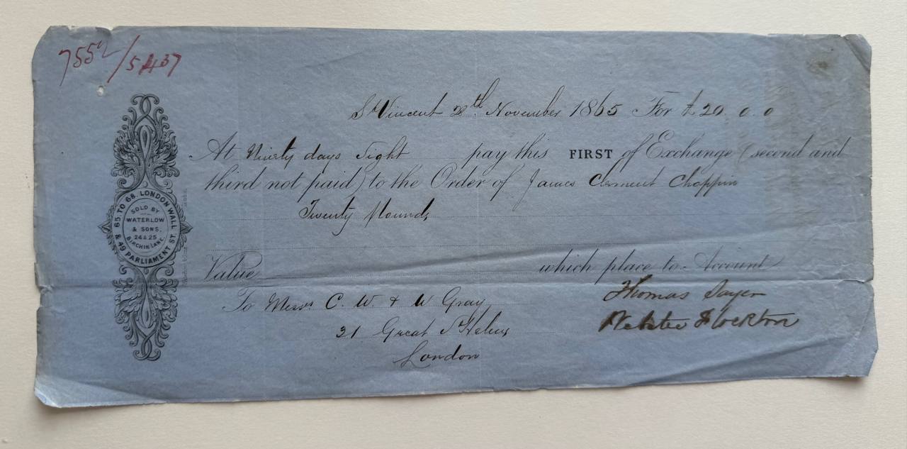 Issued in St. Vincent on 27th November 1865, this Bill of Exchange was drawn in favor of James Samuel Sheppin and signed by Thomas Sayers and Webber Hechter. Classic example of mid-19th-century Caribbean trade finance, printed by Waterlow & Sons. Blue paper adds to its distinctiveness.