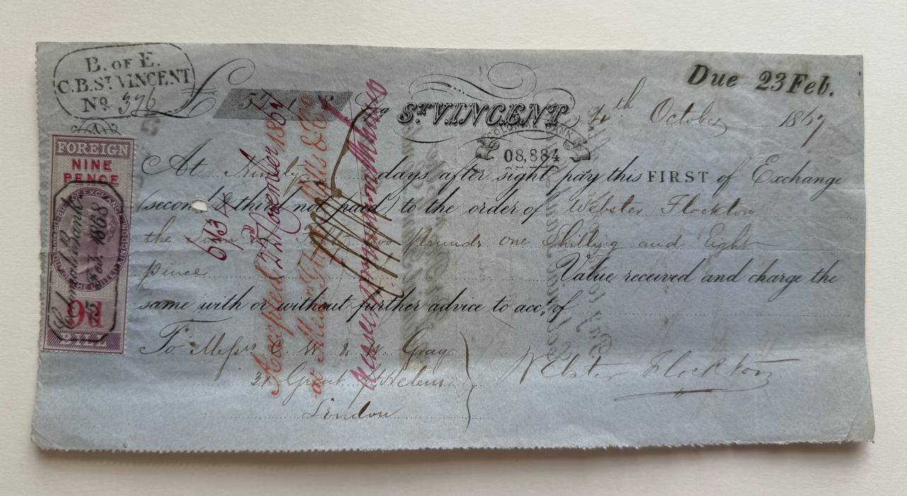 Dated October 4, 1867, this Colonial Bank bill from St. Vincent features a 9d revenue stamp and ornate handwritten text. Payable to Webster Hechter and drawn on London agents. A fine specimen showing fiscal ties between the Caribbean and the UK.