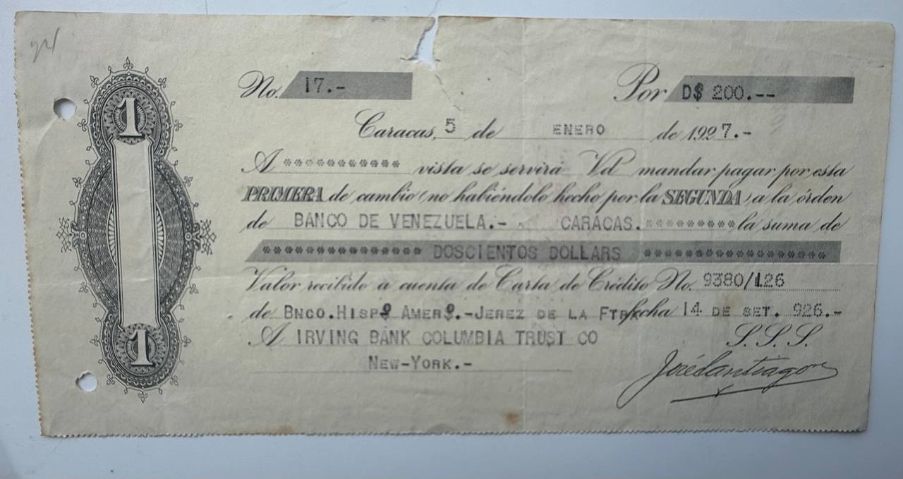 Issued by Banco de Venezuela and payable via Irving Bank Columbia Trust in New York. Dated January 1927. International transfer via Latin America–US banking corridor. Theme: Latin American Export Finance.