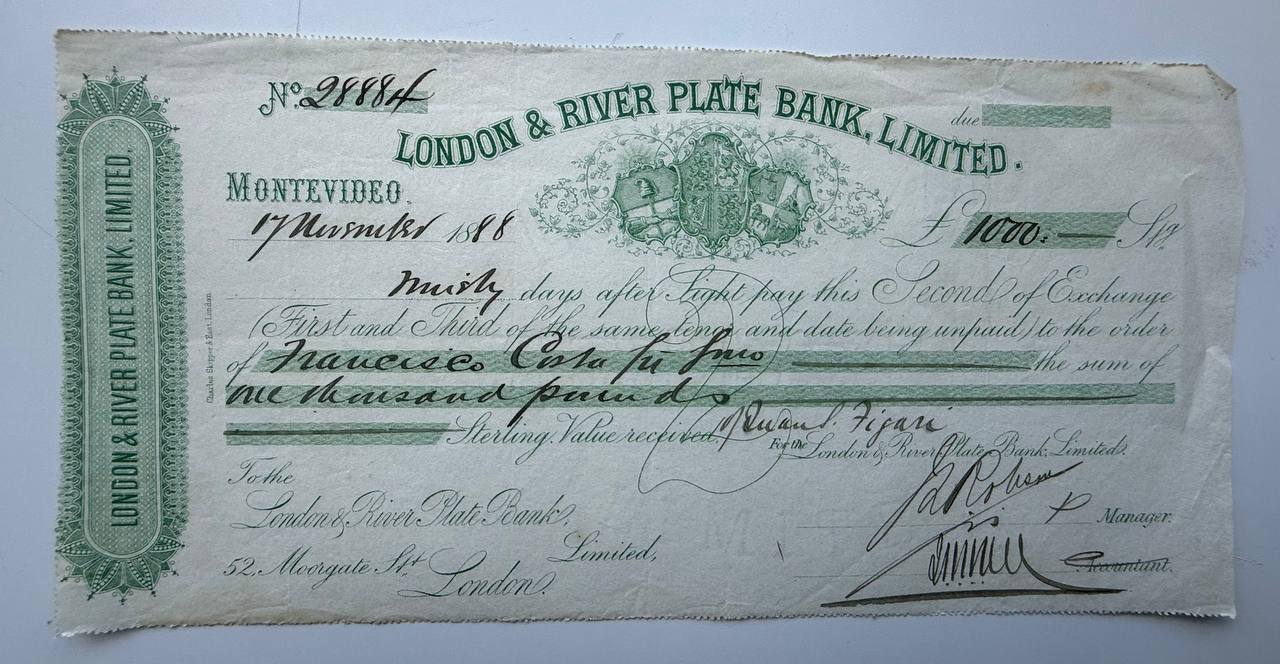 Scarce financial document from the prominent Anglo-Uruguayan London & River Plate Bank. Green ornate design and coat of arms. Issued in Montevideo, payable in London. Important specimen from Latin American-British financial history.