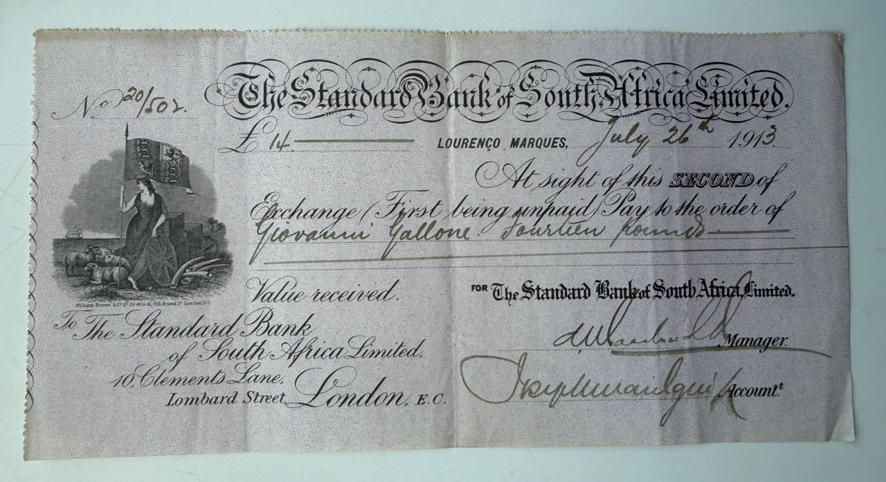 Scarce colonial bill of exchange issued in Lourenço Marques (now Maputo, Mozambique) by the Standard Bank of South Africa Limited. Dated July 26, 1913, payable to Giovanni Gallone. Document features Britannia vignette and beautiful typography. A vivid reminder of British banking activity in colonial Africa.