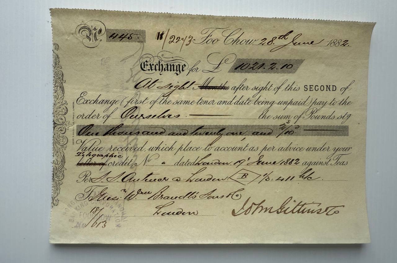 Issued in Foo Chow (Fuzhou) against a London letter of credit for tea shipment, this large-value bill of exchange includes merchant signatures and embossed port stamp. Historic trade-themed document from late Qing-era China.