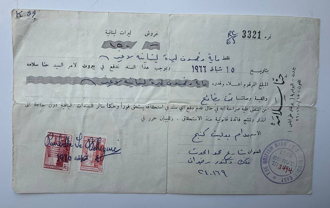 Arabic-language note payable in Beirut, featuring stamps and round seal of the British Bank of the Middle East. Theme: Mid-20th Century Levantine Finance, British Banking Legacy.