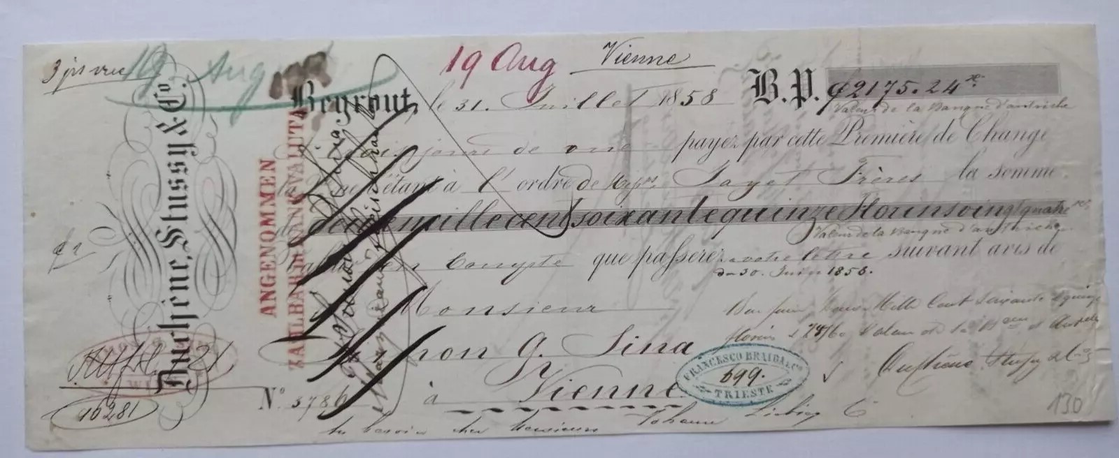 This bill of exchange was issued in 1858 by Ducherne, Stussy & Co., a prominent trading firm and agent of the Imperial Ottoman Bank in Beirut, Lebanon. Payable to the order of Mr. Sim G. Sina in Vienna, Austria, for the substantial sum of 2,175.24 Florins, the bill represents a significant financial transaction between Lebanon and Austria in the mid-19th century.