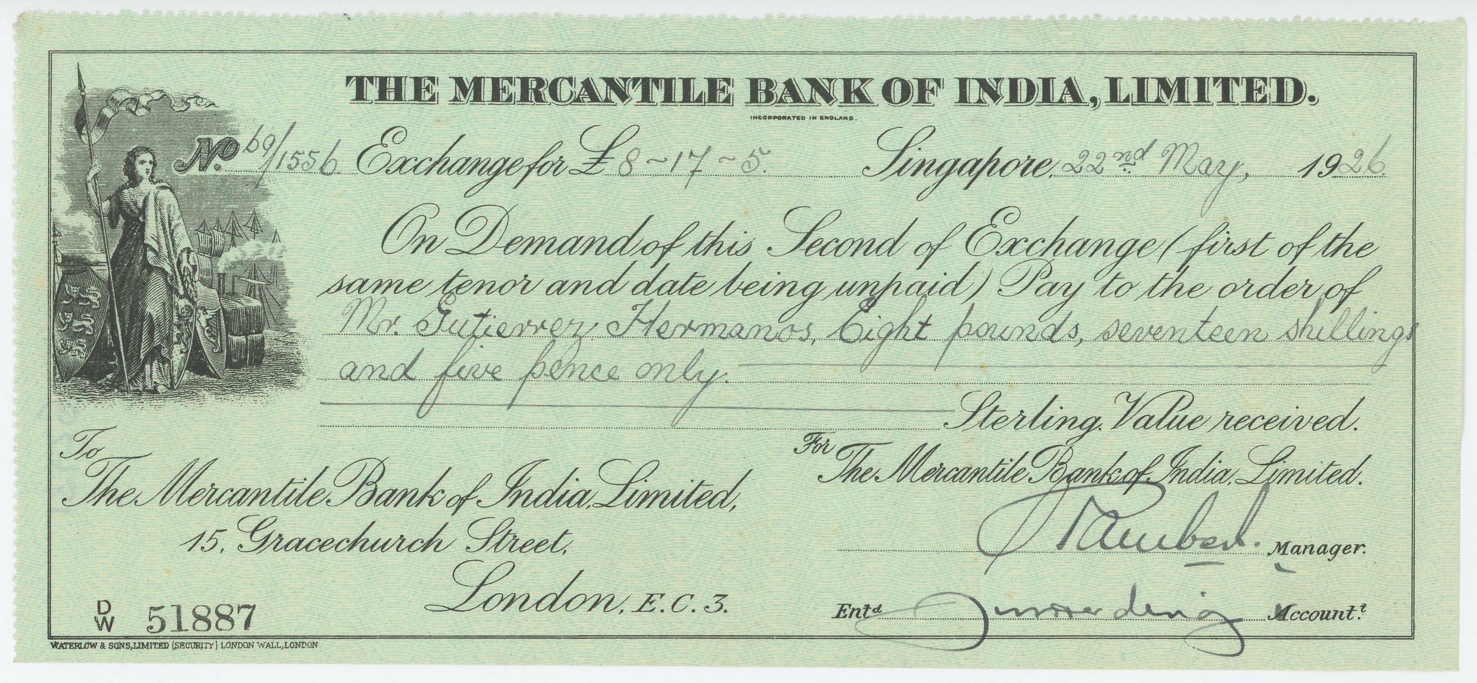 Singapore Mercantile Bank of India Bill of Exchange for £8.17.5 1926