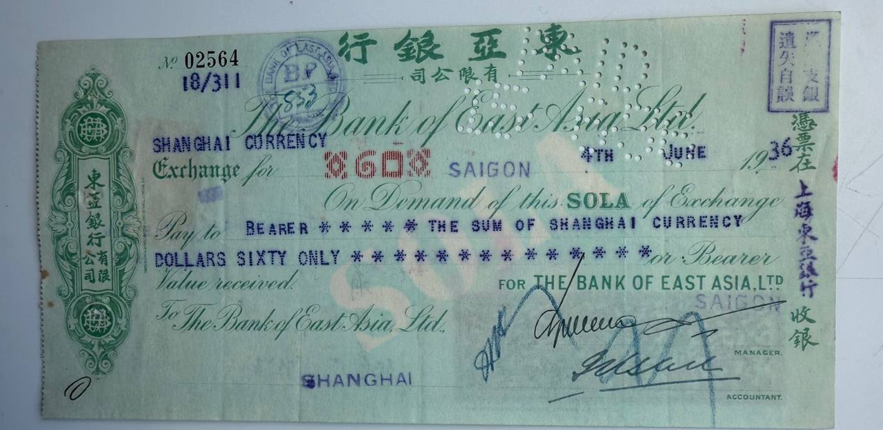 Bill of exchange issued by The Bank of East Asia Ltd, payable in Shanghai currency, dated 1936 and issued in Saigon. A rare and attractive piece linking colonial Indochina and Chinese banking history. Stamped and signed, featuring dual-language inscriptions.