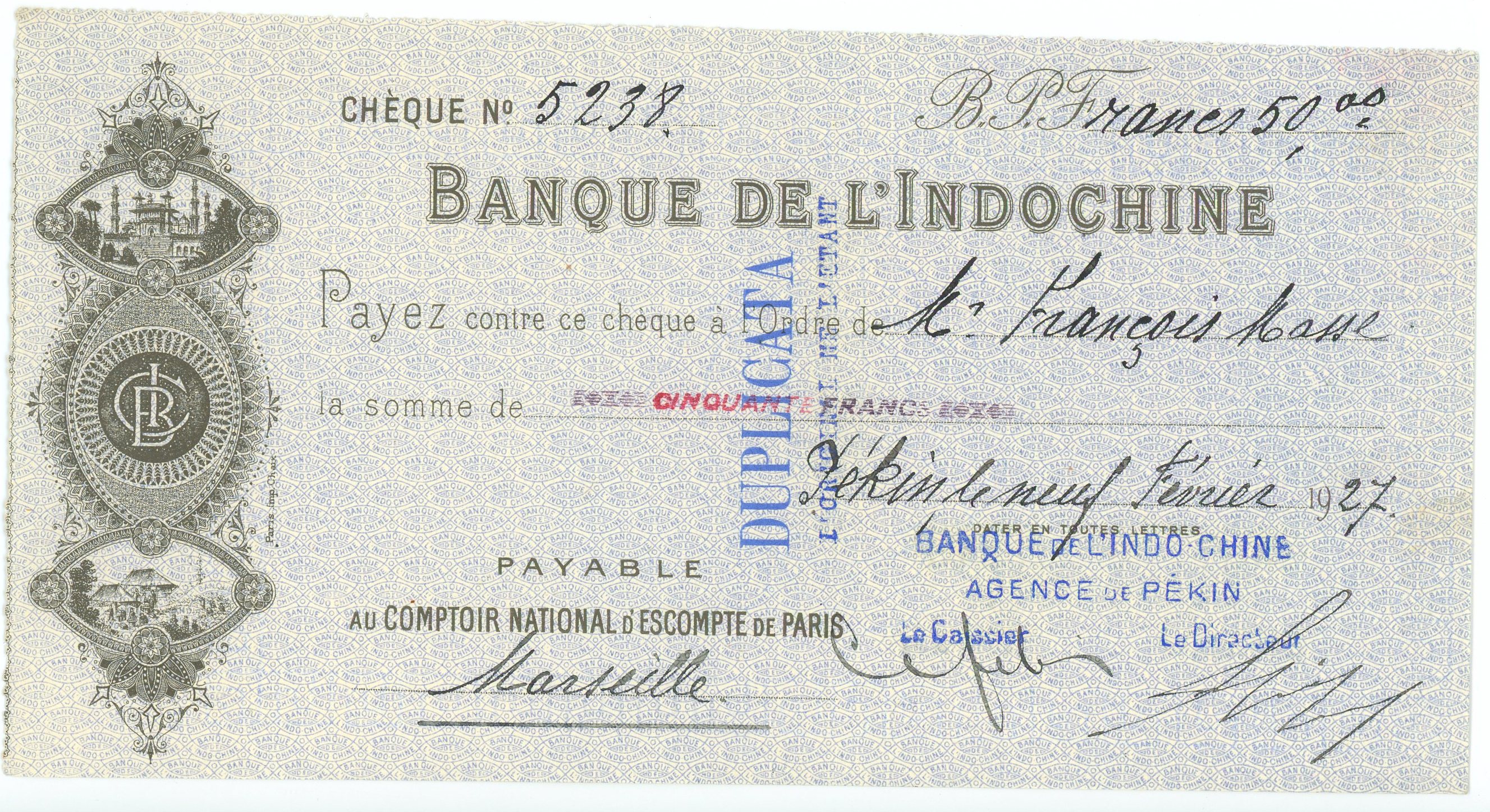 Vietnam Banque de l'Indochine Cheque for 50 Francs Beijing (Peking) Agency 1927