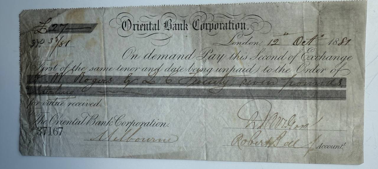 Issued by the Oriental Bank Corporation in London in 1881, payable in Melbourne. A remnant of British imperial finance connecting London and Australia. Issued for £27 and bearing period handwriting and stamp.