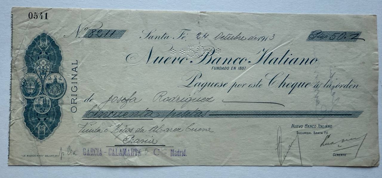 Historic cheque issued by the Nuevo Banco Italiano, founded in 1887 and located in Santa Fe, Argentina. A rare piece showcasing early 20th century Argentine banking practices with elegant typography and watermark. A great thematic piece for collectors of South American banking history.