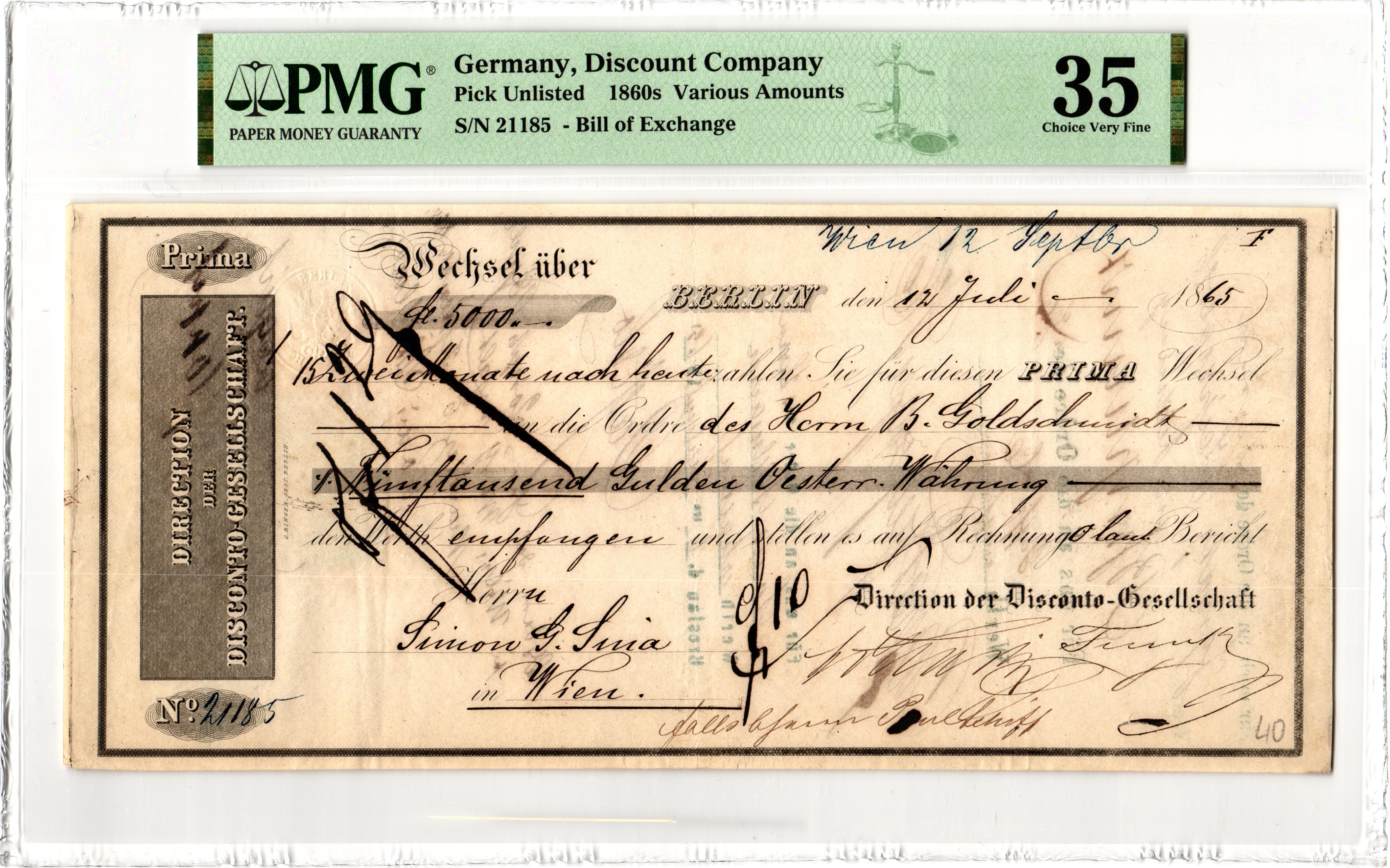 # S/N 21185 Bill of Exchange for 5000 Florins; The Disconto-Gesellschaft (lit. ’Discount Company’, full name Direktion der Disconto-Gesellschaft) was a significant German bank, founded in Berlin in 1851. It was one of the largest German banking organizations until its 1929 merger into Deutsche Bank. PMG 35 Choice Very Fine 350