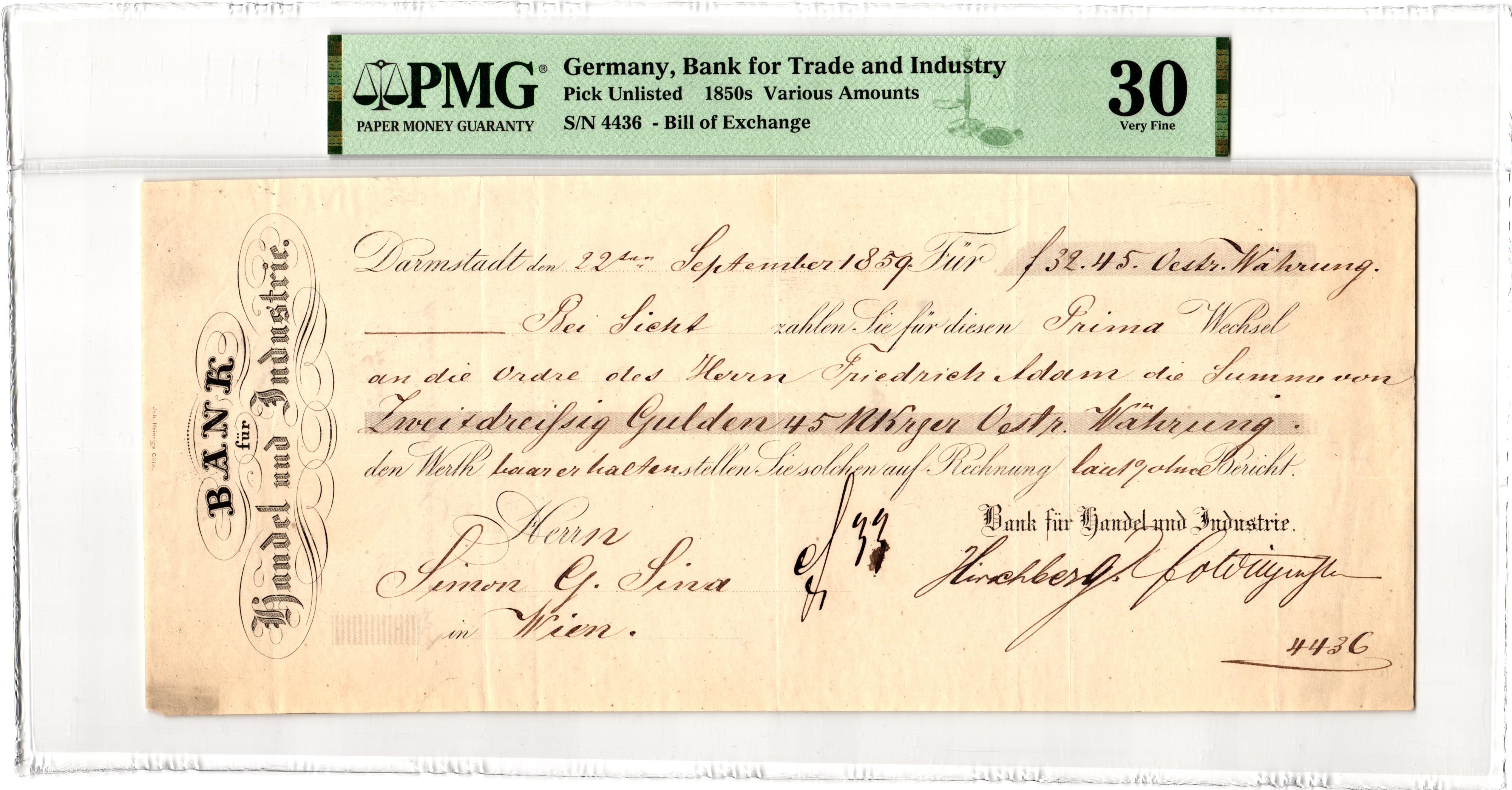 # S/N 4436 Bill of Exchange; The Bank für Handel und Industrie in Darmstadt, often referred to as Darmstädter Bank, was a significant joint-stock bank in Germany, active from 1853 until its merger with Nationalbank für Deutschland to form Danat-Bank in 1922. The Bank für Handel und Industrie was founded by Cologne bankers Wilhelm Ludwig Deichmann, Gustav Mevissen, Abraham Oppenheim and Victor Wendelstadt. It was thus the second universal bank in Germany founded as a joint-stock company (Aktiengesellschaft), after the A. Schaaffhausen’scher Bankverein in 1848. Extremely rare document from the first years of the bank operations PMG 30 Choice Very Fine 350