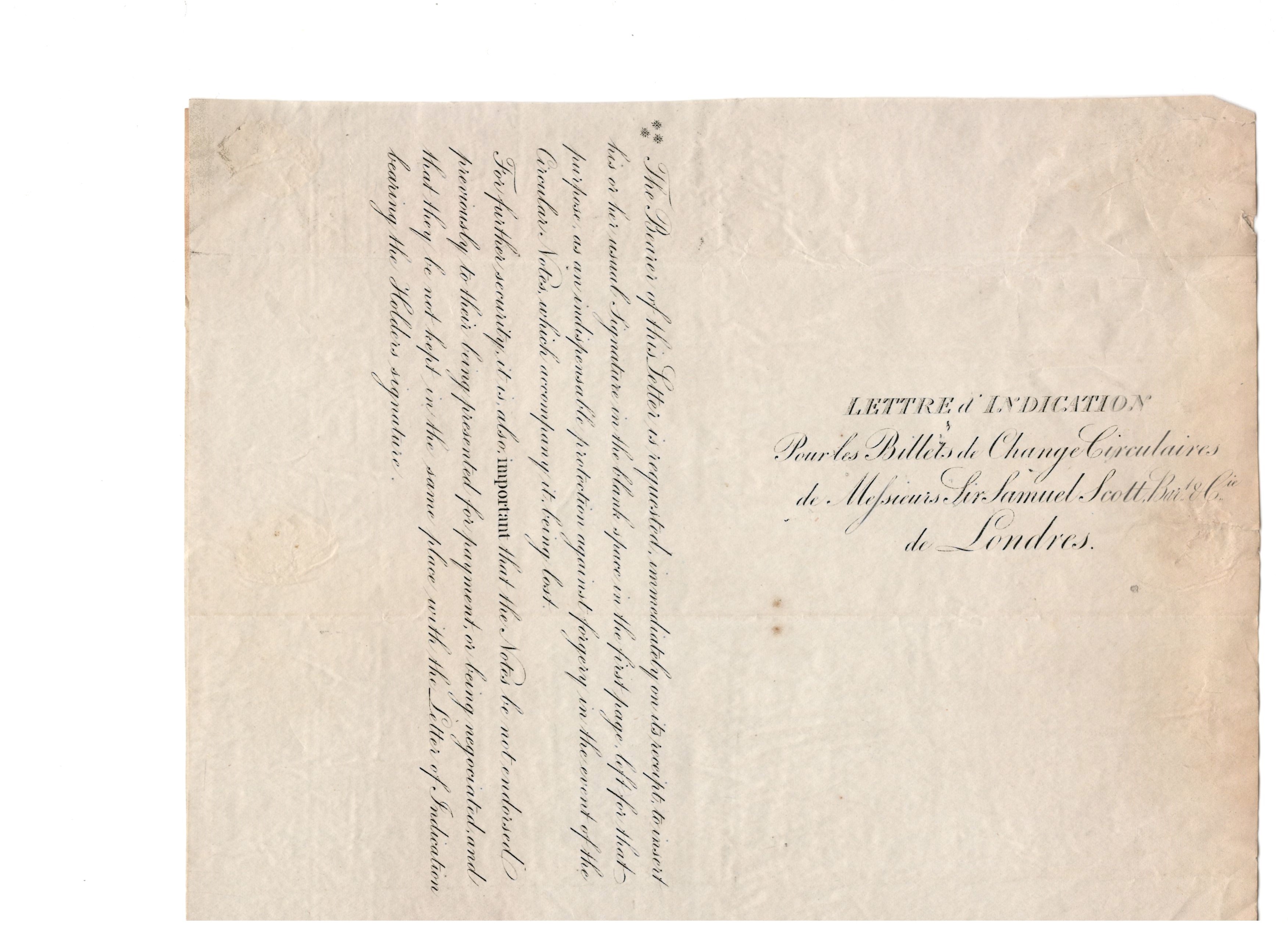 Rare Lettre d’Indication issued by the prominent British private banking firm Sir Samuel Scott, Bart. & Co. of London, regarding the use of circular bills of exchange—a key instrument for international travel and commerce during the early 1800s.